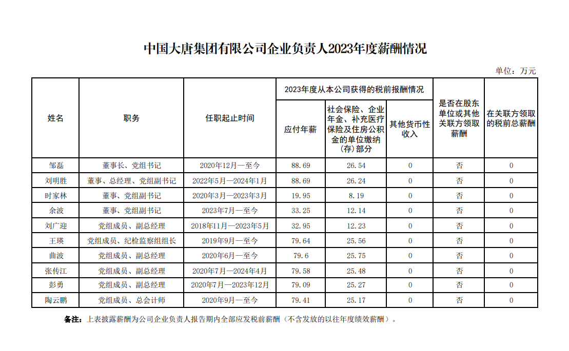 中国大唐集团有限公司企业负责人2023年度薪酬情况